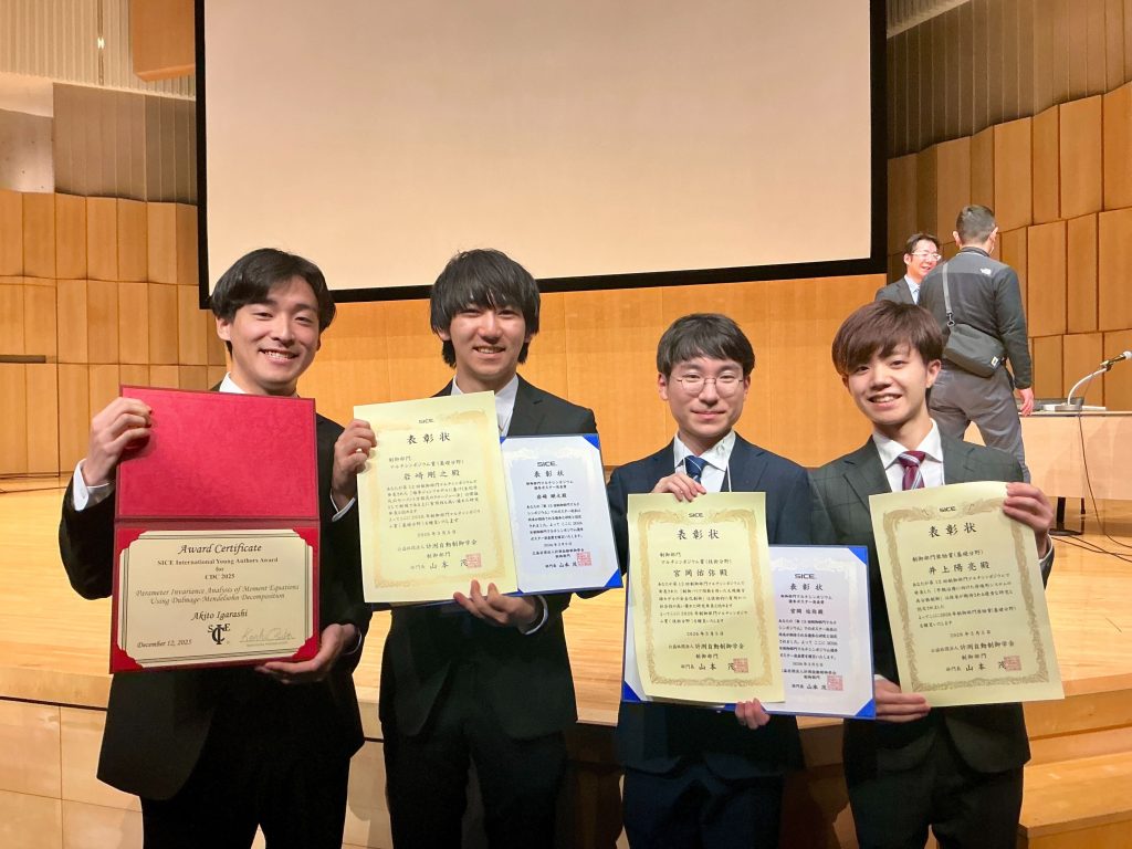 堀研究室のM2 五十嵐亮人君,M1 岩崎剛之君,井上研究室のM2 井上陽亮君と宮岡佑弥君が計測自動制御学会(SICE)制御部門の部門賞を受賞しました。2026年3月に富山国際会議場で開催された第13回制御部門マルチシンポジウムにてそれぞれ表彰されています。